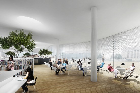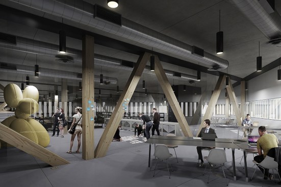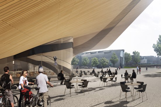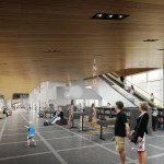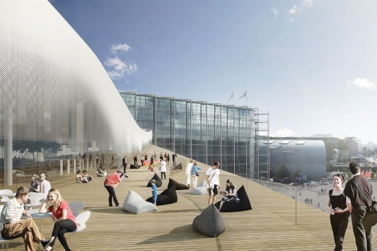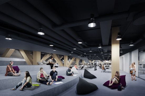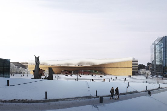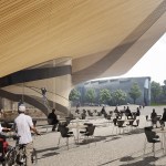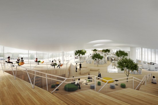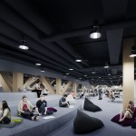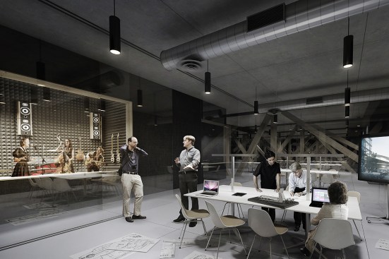 These two floors, perfectly complementing each other, are created by the building’s arching wooden volume. The spaces inside the volume will be more intimate, offering opportunities for learning-by-doing. This middle floor will be an environment optimized for contemporary media and latest tools, containing workshop spaces for music and multimedia.