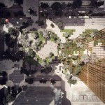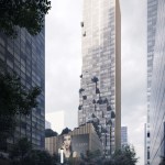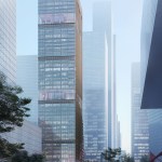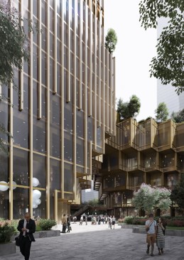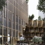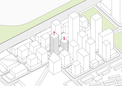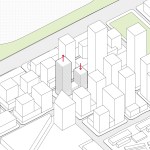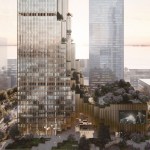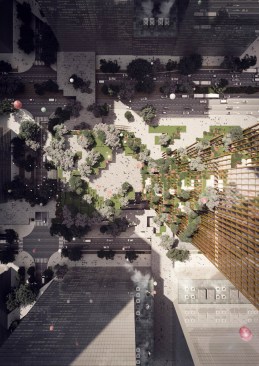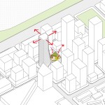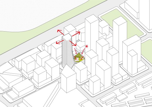 Mecanoo’s design is a composition of two volumes with a commercial plinth. The top two levels of the lower building are fused to the 238 m high tower. The volumes contract and expand to accommodate public space and vegetation on different levels. The plinth is ‘carved out’ to create a sense of scale and increase permeability at ground level. A lively meeting point, the ground floor urban square leads to the main entrances and links the pedestrian routes through the site.