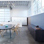 In order to reveal and enhance the found quality of the existing structure and its surfaces, the design interventions are subtle. Conduit and piping were meticulously re-routed but left visible, and the existing two toned walls were kept, with the colors changing from body-shop blue to white and grey. New construction is placed directly against the shell of the original structure, drawing attention to the juxtaposition of the new and the old.