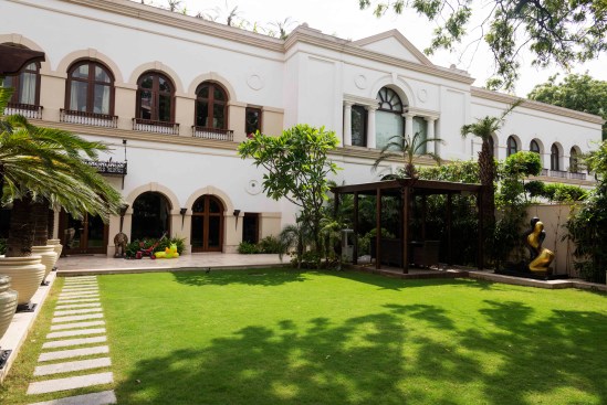 The entrance to the home is via a lush landscaped lawn. The landscaping, done in collaboration with Akshay Kaul and Associates has its level aligned with the building to make the built form and the greens physically connect with each other. An entrance walkway adorned with pergolas is flanked by a water body on one side and an open Jacuzzi on the other, while being privately sheltered from the three-storeyed building. The highlight is the open-to-sky central courtyard, that is accentuated by greens, lighting fixtures and sculptures. The courtyard maximizes daylight ingress while establishing visual connectivity within the house. Vertical movement within the house is facilitated by means of a contemporary wooden staircase and a glass elevator, both of which are located within the courtyard- augmenting it with a sense of architectonic volume.