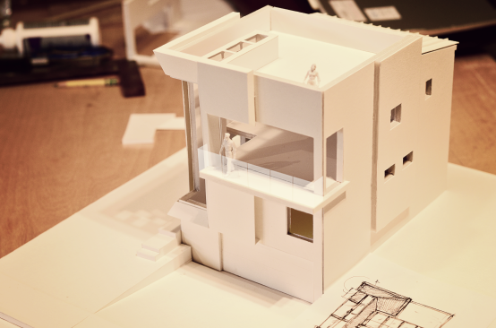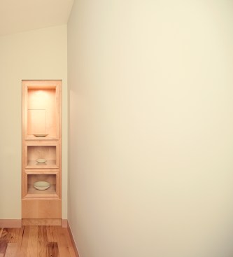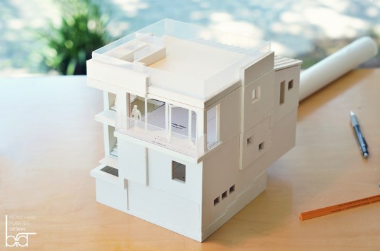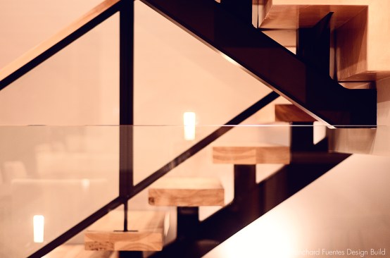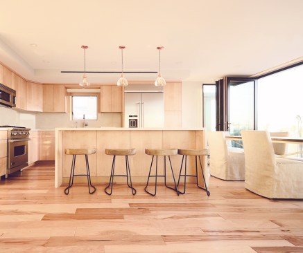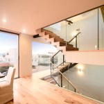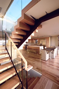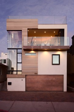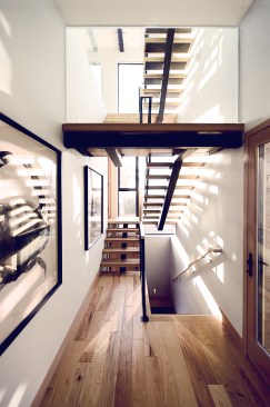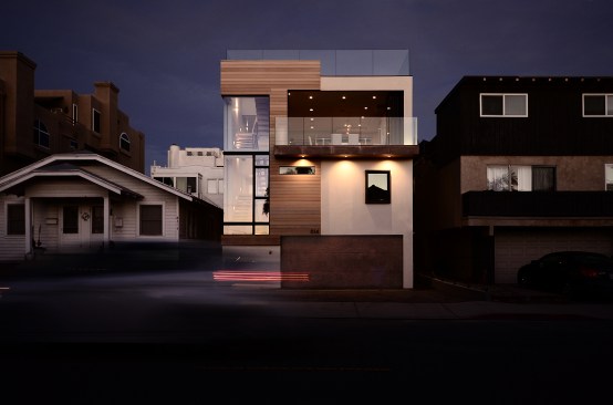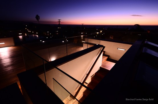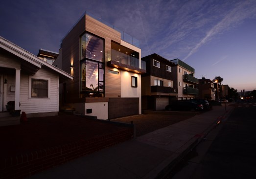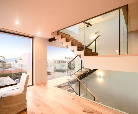 Our design solution to a ‘70s-era, nondescript, single-family residence on a half-lot in Hermosa Beach. This 1,800-square-foot remodel emerged from a simple question: What can we do with it? The Offering: three bedrooms, two baths, a choppy living room on the second floor and a two-car garage with a ceiling height more suitable for parking excavators than passenger vehicles. The Desire: Four bedrooms, three baths, an integrated living space and kitchen for entertaining, roof deck for viewing and a two-car garage—modest ceiling height, please. The Vision: Preserve what works (30%). Carefully remove what doesn’t (70%). Split in elevation new spaces 3½ feet upwards from the existing ones, design the stair as artwork to elegantly access the levels, then put it all on display through a bold expression of steel and glass. The Soul: A generous use of plate glass throughout the project affords a feeling of lightness especially between the roof deck and living room, where a glazed volume breaches the ceiling plane and materializes as a decked stair and landing assembly. A rich millwork selection from maple to hickory softens the living layer and balances the exposed steel work of the stair.