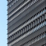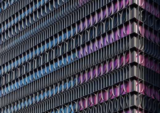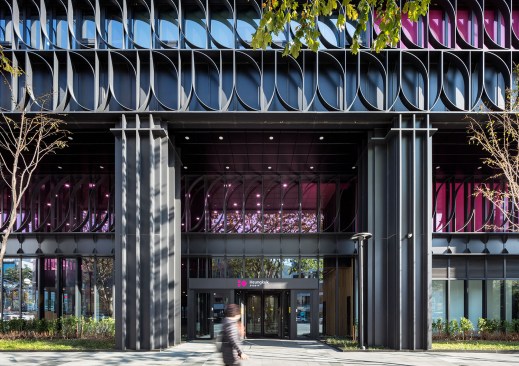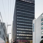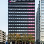 Located in South Korea’s second most populous city Busan, the Heungkuk Tower serves as an office building and sits adjacent to the coastline and close to the city’s high speed rail network. The building’s distinguishing feature is its stark black and fuchsia facade of various linear patterns. The role of the frame extends beyond decoration, continuously creating different atmospheres, filtering incoming light and making shadows across the interior spaces.