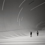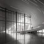 The museum faces out into the landscape – participating in the urban fabric of the city developing around the site, its glass façade subtly interrupted by the sculptural interplay between outer skin and ground. Natural light ‘floods’ the interior via a glass façade.