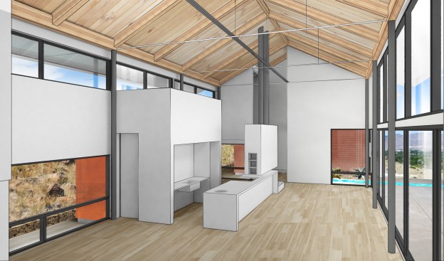 A photographer’s search for the site of his future house required a majestic environment with vast natural vistas found only in the American West. Early on, during travels for a photography shoot, he fortuitously came across a structure embodying his vision for a house. He found the architect’s identity, after which ten years passed before he found the site with his ideals. The requested program consists of live and work spaces connected by a display gallery. The brief further dictates that the forms consist of simple shapes and the materials requiring minimal long term maintenance requirements. The house is sited on the Eastern edge of the Sierra Nevada range. Its preeminent allure is magnificent panoramas from a high desert terrain of rugged topography featuring striking rock outcrops among sage brush. The live part is designed to house the photographer, his family and house guests. The work part is a photography studio with exhibit gallery for his work and art collection. The program functions are physically delineated into serial modules with interposing trellised courtyards and linked by “bridges.” The resulting long and narrow structure optimizes the dramatic views ranging from the mountain backdrop above the site to Reno city lights below. From the studio to the gallery to the living spaces, each room “connects” to the environment on two or more sides with light, ventilation and views through windows and glass doors. The relationship to the outdoors is especially strong in living / dining / kitchen module which is wrapped on three sides by a south facing terrace with a lap pool accessed through a series of wide sliding glass doors. Sustainability is integral to every aspect of the building’s design, from siting based on solar orientation with integrated landscaping to naturally weathering materials to active energy generation in the forms of photo-voltaic panels and geothermal wells.