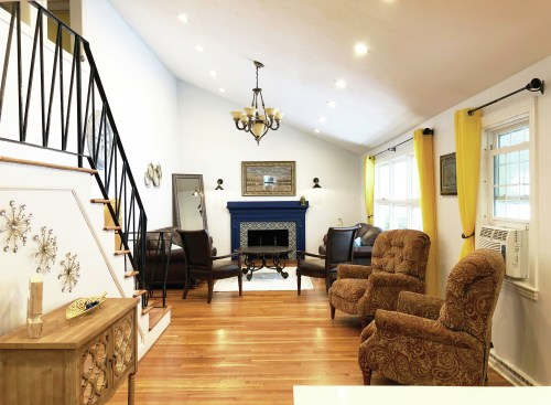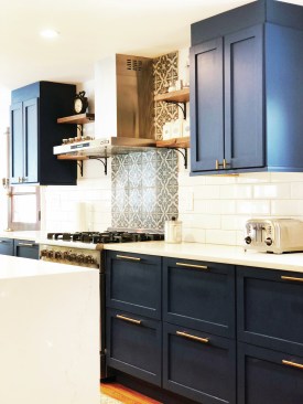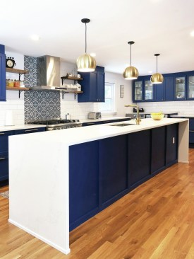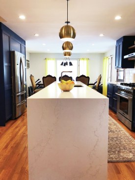 The Highgate residence, originally built in 1960, is a split level home which truly lived up to its style. The existing house having been previously renovated in the 1990s had carved up the kitchen, dining, and family room creating awkward circulation and dated finishes. Layers of greasy linoleum tile and peeling wallpaper were scattered throughout the spaces. Both artificial and natural lighting were scarce, causing a claustrophobic atmosphere. The gut renovation aimed to bring a vibrant yet minimalist vibe to the space. Flow restrictive walls between the family room, kitchen and dining room were removed to allow for natural light to flood the space. Materials such as large subway tile and painted mosaic tile were introduced to the kitchen and family room fireplace to tie the two spaces together. Existing wood floors were restored to their former glory with a rich chestnut stain. The walls received a fresh coat of minimalist white paint to serve as the canvas for the deep blue kitchen cabinets. Brass accents were subtlety placed throughout the three spaces to allow for a visual connection. Ease in design and uniqueness in materials were vital to this renovation.