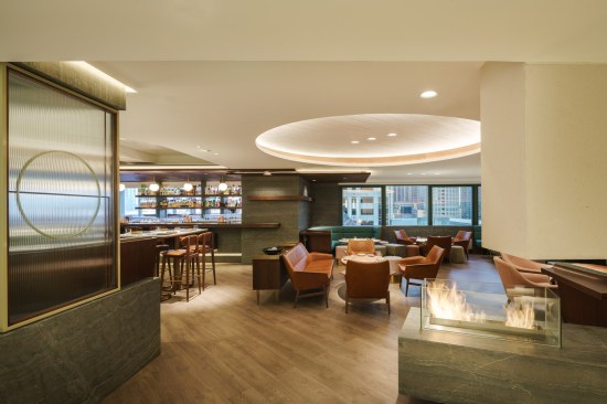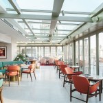 The program and site were challenging: the dark, low ceilinged space was to function as an all-day venue for both hotel guests and visitors. Fortunately, an expansive terrace adjoins the space and we were able to extend the dining room onto this terrace, creating a sunlit skyroom which forms a transition between the intimate dining room and the spectacular views from the terrace.