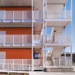 The pandemic dictated the basic contours of their solution. “Ordinarily this would have been on a dormitory model,” says Pinto. “But because of COVID, we have had to design independent units with separate air control and restrooms.” With that as a starting point, the designers were able to conceptualize the project as a series of modestly sized apartment blocks formed into a familial cluster—leading to their key decision, one with significant implications for the project’s fast rollout. “We decided to go with a modular solution,” says Pinto, with 132 of the sleeping units located in two permanent, three-story resident buildings, and the remaining 100 located in temporary mobile trailers. Relying on these modular typologies—Crate Modular shipping crates, conventional prefabricated units from Palomar, and trailers from Guerdon, all installed by Vesta Modular—the architects reduced the production and assembly time to meet their deadline early.