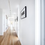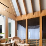 In plan, a collection of volumes is arranged along a central spine reminiscent of vernacular “shotgun” cabins, with the public and private spaces of the home situated on opposite ends. The main corridor, which doubles as a gallery, is differentiated by thin vertical windows that balance the requirement for natural light with the need to provide space for hanging artwork. In every room, windows provide abundant natural light and frame views of the surrounding landscape.