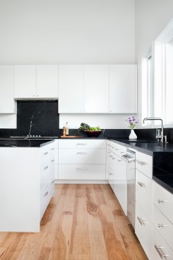 The exterior of the home is defined by clean lines, a sculptural gable roof, and a contrasting material palette of corrugated metal panel and warm cypress. While indicative of the clients’ modest budget, the materials also evoke the residence’s rural setting. A tapering limestone chimney was inspired by an existing shed on the 47-acre property made of dry-stacked local stone. Throughout the interior, white walls and ceilings are offset by carefully-considered embellishments such as a limestone hearth in the living room and soapstone counters in the kitchen. Pecan floors are a nod to the home’s rustic surroundings.
