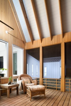 Particular attention was paid to creating spaces that would enable hosting large groups of friends and family, blurring the line between indoor and outdoor space. The stark white metal cladding is broken at various intervals by warm cypress siding that defines a series of rooms outside the house, including a temple-like screen porch that extends from the volume containing the main living spaces. A shaded outdoor sculpture studio doubles as a stage for casual summer concerts hosted 3-4 times a year.