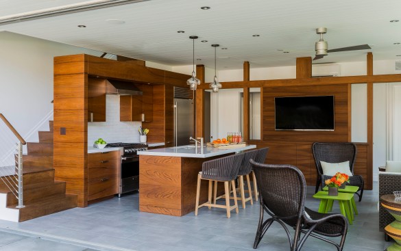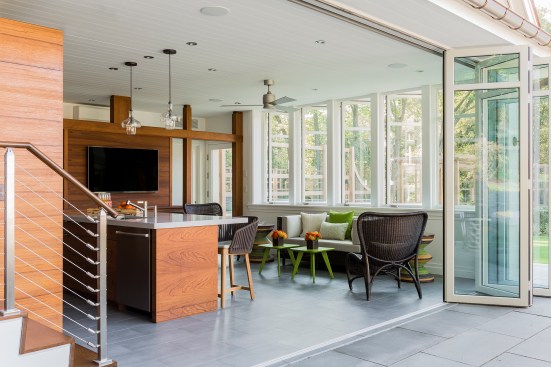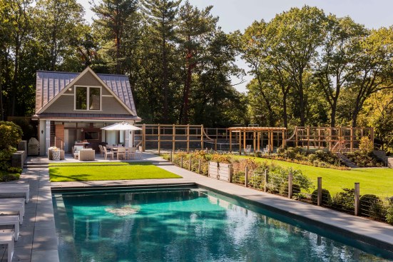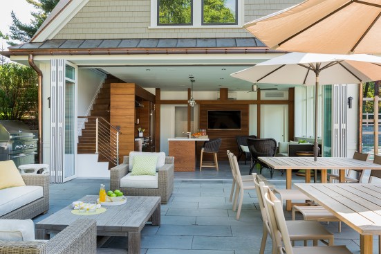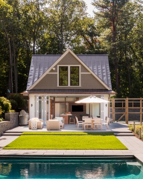 The new clubhouse bookends the pool and terrace, extending the connection to the main house and adding additional entertaining space. With a full kitchen, indoor sitting room, changing area and laundry room as well as an outdoor terrace, the clubhouse can be the center of a range of activity, from sporting to socializing. The pool-facing folding wall seamlessly allows for the full expansion of the space from inside to outside – perfect for this active family.