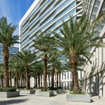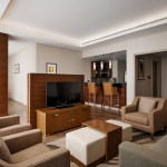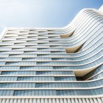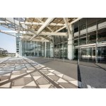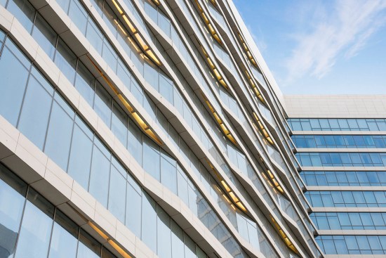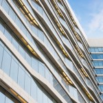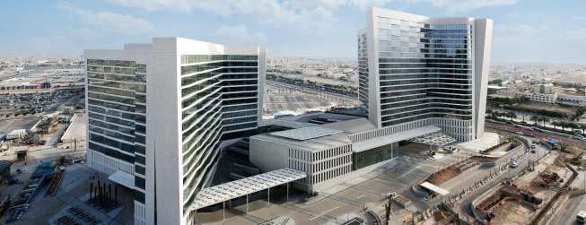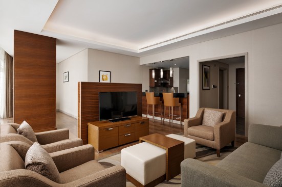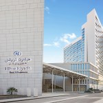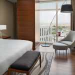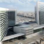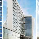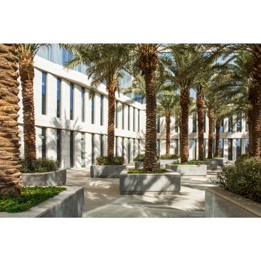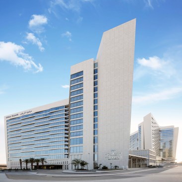 A beacon of contemporary living and hospitality, the new Hilton Riyadh brings 5-star comfort and amenities to the quickly growing capital city. Omrania | Goettsch Partners designed the complex in a joint venture. The project consists of two pinwheel-shaped towers — a 20-story luxury hotel with 645 rooms and a 14-story residential building of 221 furnished apartments — connected by a three-level podium building with a signature roof terrace. Conveniently accessible to the King Khalid International Airport and the business districts along King Fahd Road, it is sited on 3.75 hectares along the Eastern Ring Road, adjacent to a future Riyadh Metro station as well as a shopping center and the Granada Business Park (also called the GOSI Office Park), designed by Omrania. Two levels of parking are hidden below grade. The two towers are subtly distinguished by their forms and surface geometries as well as their differing heights. Folding surfaces and curving planes define the hotel tower’s dynamic building envelope. The residential tower is more understated, defined by smooth planes. Together, the two towers enliven the skyline as their profiles change when seen from different angles. Their sculpted massing reflects internal program requirements and the urban context, while balancing the need for privacy and views. The semi-reflective glass curtain wall systems allow generous natural light penetration when desired—notably at dawn and dusk—and provide sweeping views of the growing metropolis. The landscape concept includes permeable “softscape” across the entire development, with the roof garden plaza serving as a focal point visible from the rooms above. Hotel interiors reflect a refined, distinctly contemporary identity with references to local culture and craftsmanship.