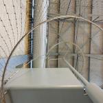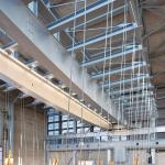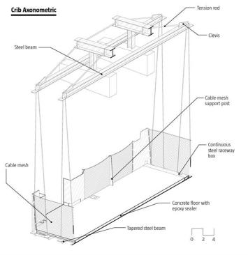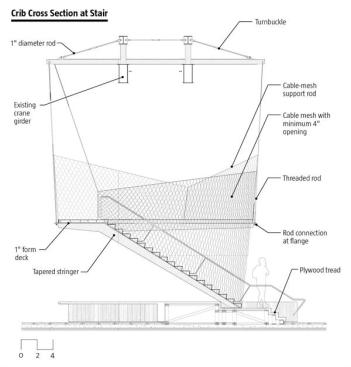 The biggest technical challenge was reducing vibration in the suspended mezzanine. The original design placed two large steel beams on top of the crane to dampen vibration and to suspend the Crib below. When vibration levels were still perceptible, inconspicuous tie-ins to the building’s steel structure were added along the sides of the Crib as additional bracing. The renovation team fashioned safety railings from stainless steel cable mesh (X-tend Mesh by Carl Stahl DécorCable), which drapes off of heavier steel cables held to the suspension rods with stainless steel fittings. The Chicago office of German firm Officium Design Engineering generated 3D models to study the effect of the cable on the Crib structure, which must resist additional bending forces because of the weight of the mesh. Steel plates were welded to the corners of the Crib as a place to attach the mesh and help keep it taught.