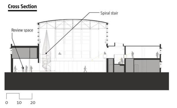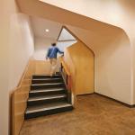 One of these elements is new lighting—suspended 4-inch-diameter acrylic tubes, each with four fluorescent lamps. The second is a 32-foot-long guillotine wall along the south wall that lifts via a series of pulleys to reveal a multipurpose space, which functions alternately as a venue for studio crits, exhibitions, or video projection. The third insertion, a spiral stair rising to a suite of third-floor faculty offices, occupies the space’s southwest corner. Fabricated from a series of steel-plate risers welded to resemble a single folded surface, the stair appears to lift slightly off the studio floor on a wooden platform—a bit of conceptual sleight of hand. In reality, only its shroud of steel cable mesh, which has a spiraling stainless steel guide rail to lend it shape, hangs from the truss overhead.