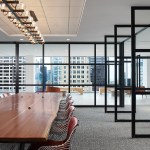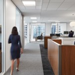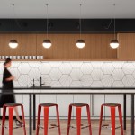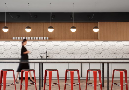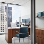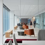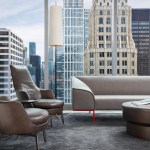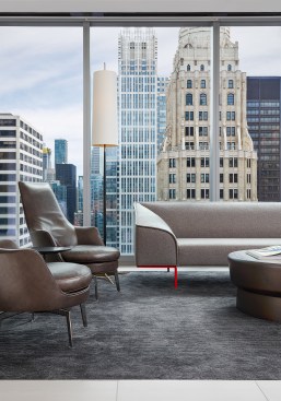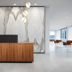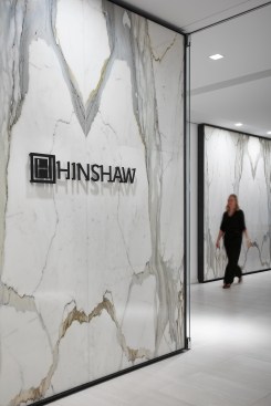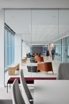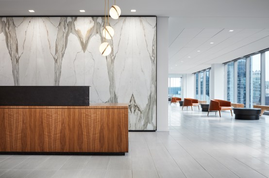 SCB’s relationship with Hinshaw andCulbertson spans 15+ years, having designed over 20 office locations for the national law rm. The driving force behind the design of Hinshaw’s new Chicago office was twofold: celebrating innovation and reinforcing Hinshaw’s strong connection to Chicago, the place where Hinshaw has been headquartered for 84 years. The spatial organization of the office is reflective of the forward-thinking nature of the firm’s leadership and culture – allowing people direct access to light and views and eliminating the hierarchy of space among attorneys. As the first Hinshaw location to utilize universal-sized offices, the design allows for greater efficiency throughout the space and creates flexibility to accommodate future growth. The space plan for the 121,000-square-foot office was also informed by key adjacency needs between partners, associates, and administrative staff. This new approach to space planning and standardization of office sizes reduced the firm’s square footage per employee by 45%. The look and feel of the shared spaces is timeless and tailored; its overall sophistication is punctuated throughout with edgier elements and unexpected moments to call attention the rich artistry that this city has to offer. Works by local artists and photographers abound and visitors will find a unique surprise in the stairwell connecting Hinshaw’s four floors, a nod to the urban fabric that makes Chicago unique. A curated palette of materials including calacatta borghini marble, warm woods, and steel paired with contemporary furnishings evoke a sense of urban hospitality throughout the client-facing spaces. The interior design for the space also capitalizes on the panoramic views to the city and Lake Michigan. Each view from the floor-to-ceiling glass expanse are treated as captivating, dynamic pieces of art that constantly change throughout the day and year.