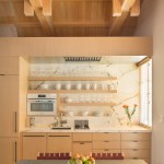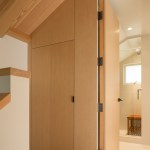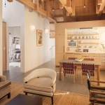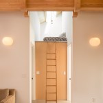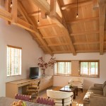 The design concept opened up the ceiling to expose the roof trusses, some of which needed to be replaced due to dry rot and seismic stability. A kitchen/bathroom woodclad “service cube” was inserted into the resultant volume. The grey floorboards are a modern take on the typical barn flooring. The end design maintains the historic exterior while updating the interior for today’s modern living standards.