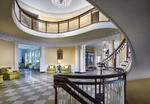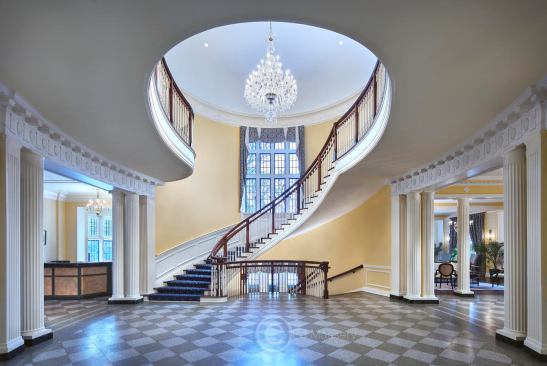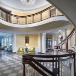 The complete restoration of the grand entry replaced the rotunda ceiling, upgraded finishes, and refurbished the grand staircase. New downlights were added to enhance lighting and provide for safe egress for the entire balcony and the upper stairway. The finishing touches of new draperies, carpet, chandelier, and two Edgeworth Club insignias in the first floor railing landing completely bring this grand entrance back to life.