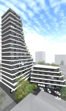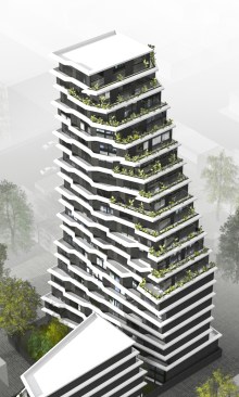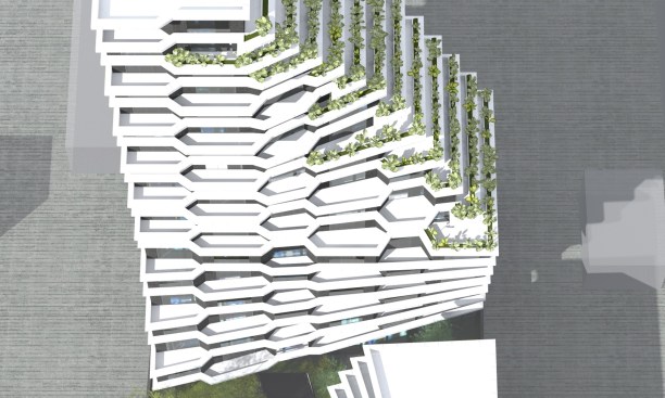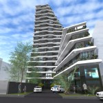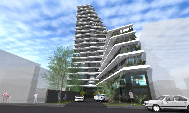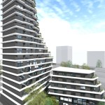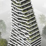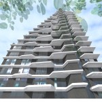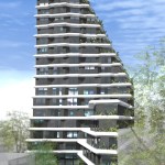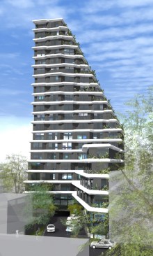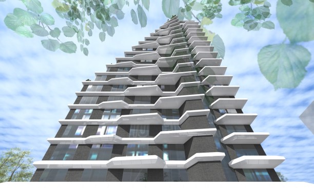 As the apartment building gains height, it twists at different angles in the same direction. This arrangement required individual designing of every apartment and ones, that face the sea, have terraces.