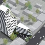 Sense of smooth gradation and movement comes from both, the spatial positioning of the buildings and the design of each. For them to be perceived as a consolidated structures, the taller building cedes the foreground to the five storied hotel/office building, with oblique road beside it that leads to the underground garage.