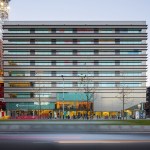Three existing buildings and four new projects create a compact, vertical educational quarter that provides daytime and part-time education to almost 20,000 students, with a mix of academic uses, student residences, retail units, cafés, bars and restaurants, new public sports facilities, a crèche, a youth club, a students’ club and many new public external spaces, all integrated into the existing neighborhood.