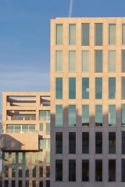 Each residential façade is a hybrid of two different façade types: one being an array of identical vertical windows, the other essentially an expression of the building's structural grid. The latter offers the apartments magnificent views and also incorporates their outdoor spaces, including the large terraces on the upper floors. The two façade types coexist in a seemingly accidental relationship. The addition of sky boxes gives a certain plasticity to the building volumes, allowing (some of) the apartments to extend outside the building perimeter, redirecting the view back to one’s own façade.
