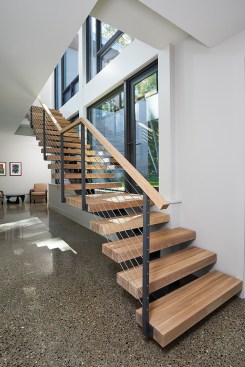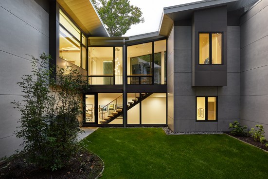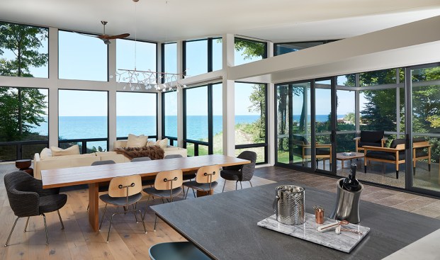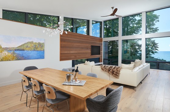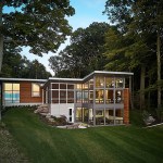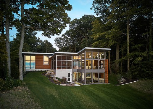 Sitting on the edge of Lake Michigan, the residence is a series of solids and voids wrapping around a steel skeletal frame. The voids create secluded spaces while the solids screened off interior and exterior spaces from the neighboring houses. The frames are infilled with glass where lake and forest views are possible and with solid panels where privacy is desired. The soaring roof plan opens to the lake exposure and maximizes the natural light.