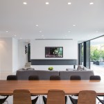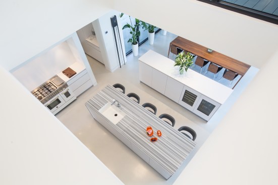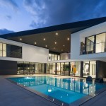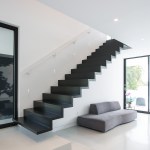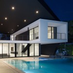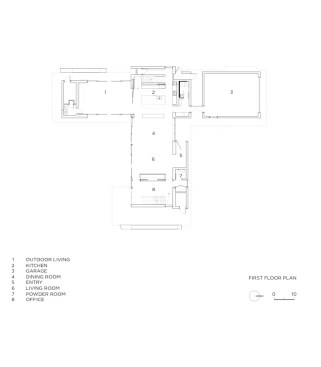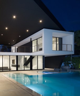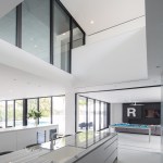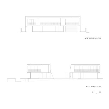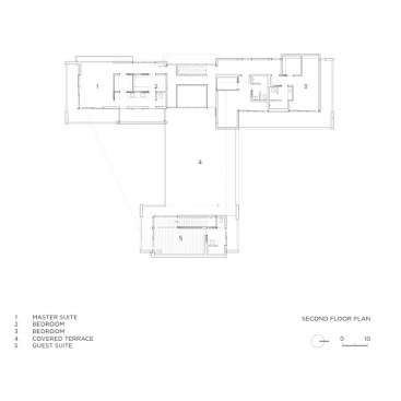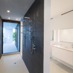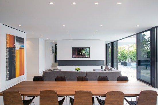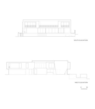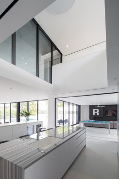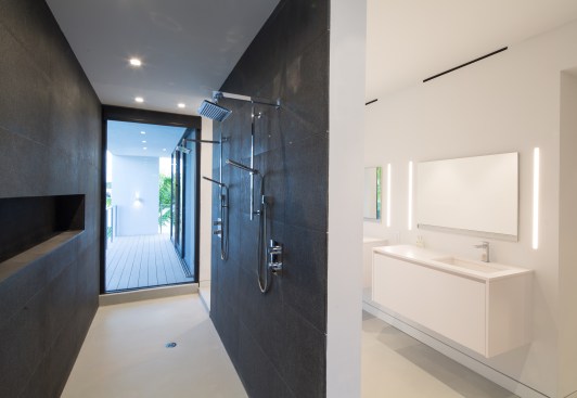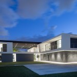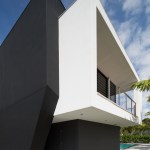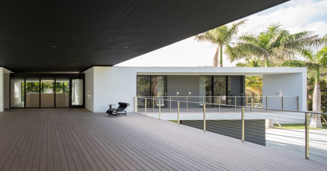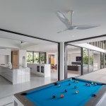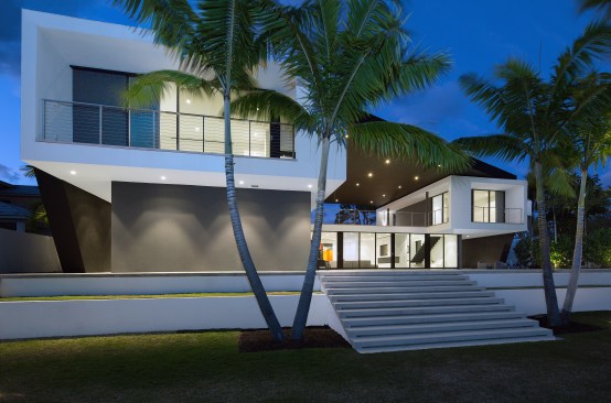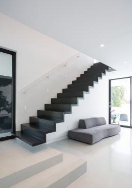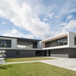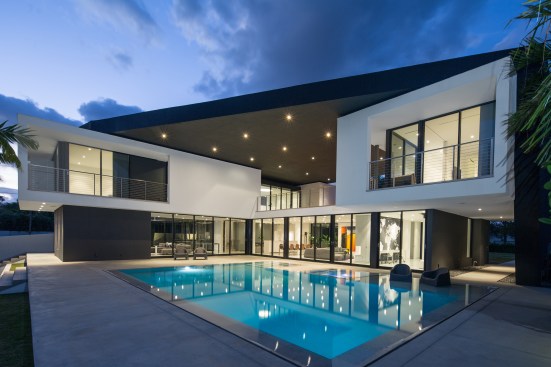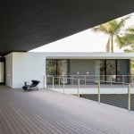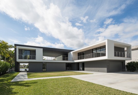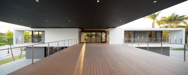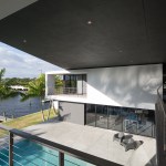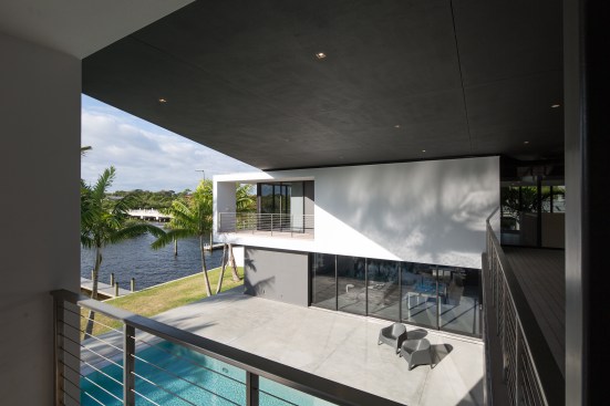 The weather in Florida plays a vital role in construction as well as design. High humidity, heavy rains and the occasional hurricane have all quite naturally influenced the design. It is unusual for a Florida waterfront property to face south. Our site overlooks a connection to Florida’s busy inland waterway. The design solution requires we shelter the outdoor space from the mid-day sun. A dominant, independently supported, “shroud” provides this coverage as well as creating a frame within which the individual spaces connect. The second floor spaces slide out beyond the first floor footprint to provide covered outdoor spaces around the pool. This gesture also creates the open second floor terrace in the center of the house. The all glass living room displays the view of the waterway over the axis of the endless pool whose edge blends with the currents. Each of the four bedrooms has a private terrace and a framed view of the busy waterway. All of the ceilings on the ground level are ten-feet high. All of the “windows” on this level are floor to ceiling and over four feet wide. The doors of the “outdoor” living room disappear into lateral pockets, and, when all are open, the room takes on a decidedly different attitude.