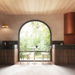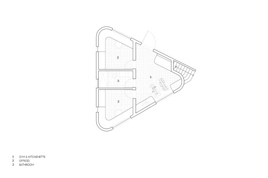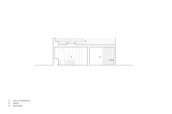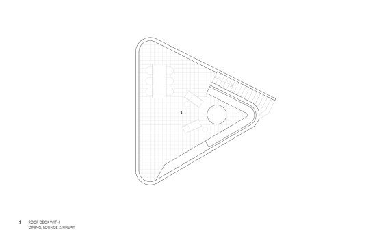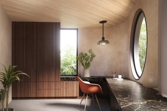 A product of the pandemic work-from-home needs of a young entrepreneurial couple, the Hollywood Dell accessory dwelling unit is smartly configured to be adaptable to guest use or rental in the future. Designed by Toronto-based AAmp Studio, the 600-square-foot, wood-frame ADU fits snugly into a triangular site behind a 1920s Spanish-style home in Los Angeles’ Hollywood Hills. This specific context drove formal decisions, such as employing warm terra cotta siding that riffs on the original home’s roof tile in the same material. The structure’s curved corners and arched and circular windows likewise reflect tropes of Spanish vernacular. Two offices flank a full bathroom and a small kitchenette outfitted as a gym for the clients; Murphy beds in each office facilitate a transition to guest or rental use. A rooftop deck further maximizes the project’s small footprint. Accessed by an exterior stair, the space recaptures the outdoor area surrendered to a new backyard pavilion and takes advantage of the property’s sweeping views.