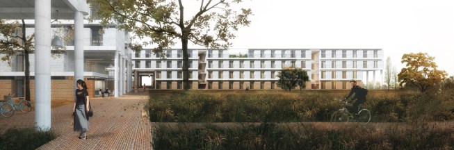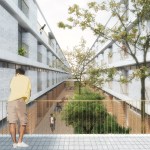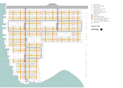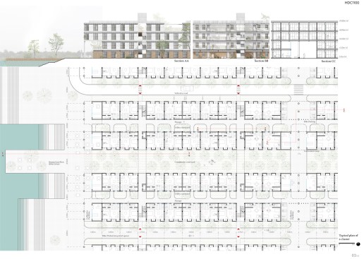 Semi-open collective facilities such as shops, bike parking, crèche, etc. are integrated at the end of each cluster. The campus is served by simple loop of streets and cycle tracks, interconnecting all the clusters, collective facilities and recreational grounds and converging at the riverfront, which has been developed as a public space with market.