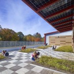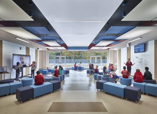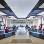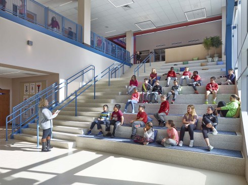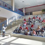 Following principles of 21st Century Learning, areas for collaboration and an extension of the learning environment abound. Each floor of the classroom wing is organized around a collaborative learning commons with writable wallcoverings and moveable furniture accommodating a variety of learning and teaching styles. Integrated within the primary building circulation and extending outdoors, the learning stair serves a secondary purpose as a large group gathering space used for presentations, performances, or small group work. Expanses of glass and ample outdoor space continually merge inside and out and offer differing mediums for learning and gathering, including a light-filled media center with reading garden and a second floor rooftop learning terrace.