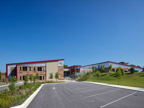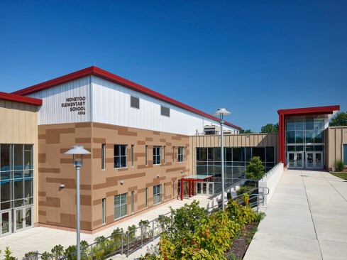 Located on a sloping site adjacent to a forested area and stream, the design for the new Honeygo Elementary School aims to engage with the land, rather than work against it.