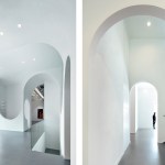 Entering the gallery through an opening in the monolithic facade, the arch-like curves continue to the interior and gently merge into a clean white space for exhibiting the artworks.