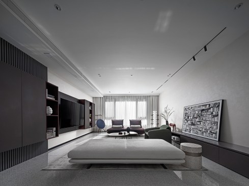 Inside the living room, the design does away with partitions, the space naturally opening up to a subtly colored background filled with detail and texture.