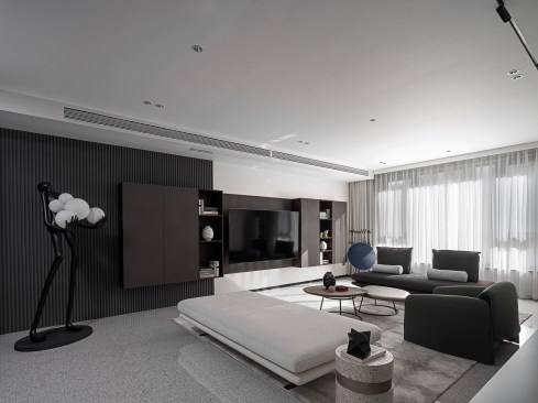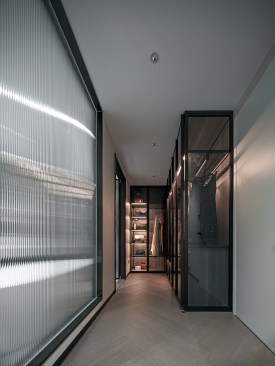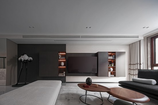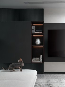 The floor is covered by the elegant patterns of terrazzo tiles, custom wooden decorations fill every corner of the space, and unpredictable terrains are specifically arranged for the owner’s cat to play with.