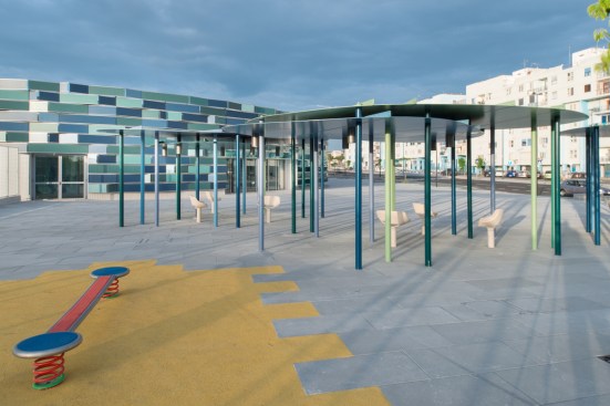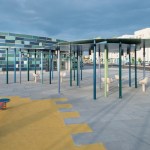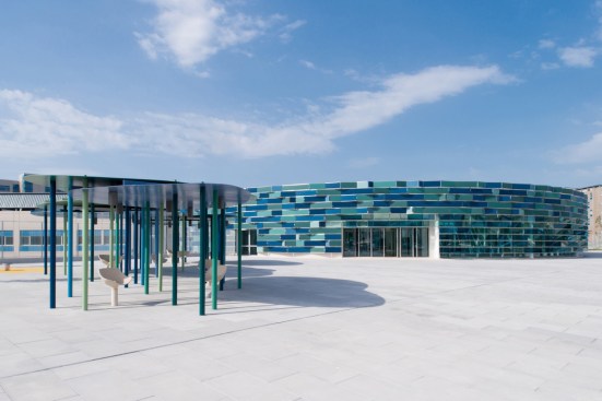 The project by IaN+ concerns a public square and an entrance hall that integrates different reception services, completed last March, as well as a system of distribution paths giving access to the hospital, currently under construction. The system of reception spaces in the new Ospedale del Mare in Naples is immediately evident due to the presence of a large round volume and exterior surfaces clad with colored panels of fiber-reinforced concrete and glass. This is the entrance hall, which is directly accessible from the metropolitan areas through a square positioned linearly along the main access road until it expands in correspondence with the hall. The paving of the square distinguishes an area next to the road, where industrial paving with a resin coating and “green Alps” pebbles has been used, from one that is more protected, characterized by lighter colored large slabs of concrete and natural aggregates. The two areas interconnect according to a variable geometry that includes the benches and creates a sort of artificial landscape from which metal shelters emerge along with the trees.