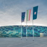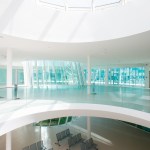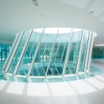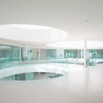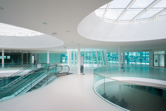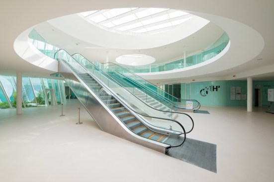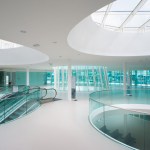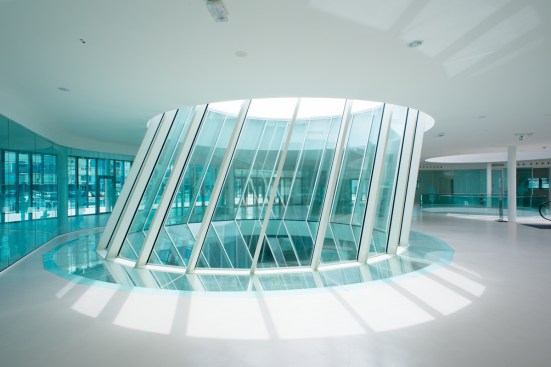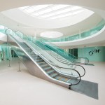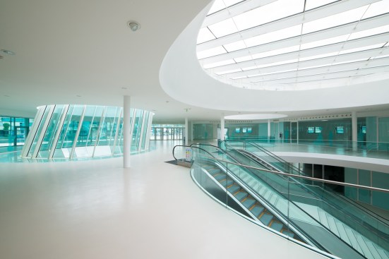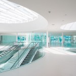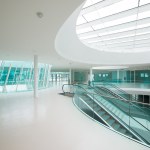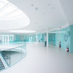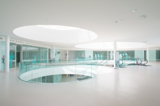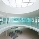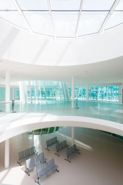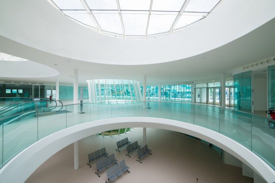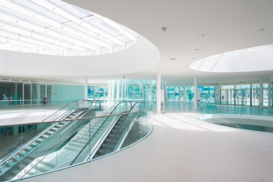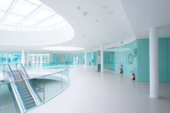 The hall offers visitors the perception of a large and dynamic space which exploits the circular form to distribute a multitude of functional and service areas around the main paths. The direction of the path that leads from the hall to the hospital is rotated by 30 degrees with respect to the entrance doors. The placement of the escalators that connect the lower levels of the hall emphasizes the same direction. The slim metal pillars with a circular section disregard the regularity of the structural framework and are positioned freely in the space. The entire volume, which is divided into three floors, is filled with the light that filters through the curtain of colored glass imbued with blue and green tones, and with the light that, thanks to three large circular and axially offset openings that pierce the roof and the floors, obliquely permeates all levels of the hall.