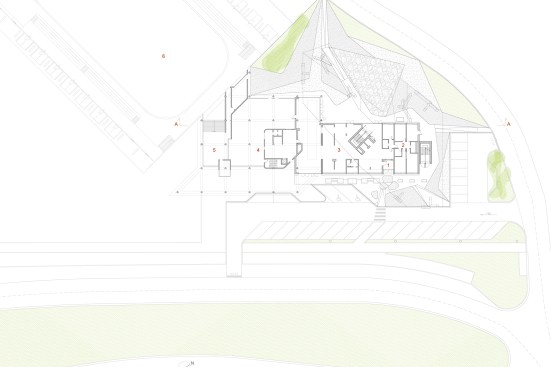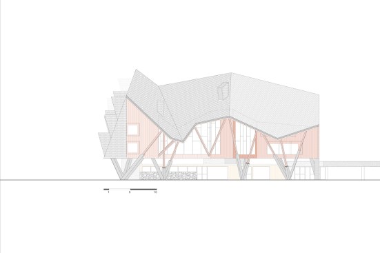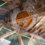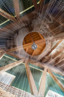 -The hotel is partially raised from the ground by three pillars, evoking the feeling of being in a treehouse, held up by the tree's branches.