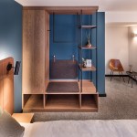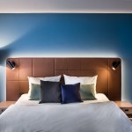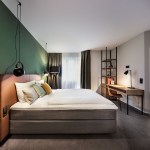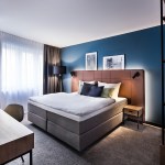 In the hotel room, you will clearly notice that comfort and modernism work together as a whole, and express themselves in detail. Soft textiles and round shapes are featured to accentuate clean lines and hospitable functionality. This functionality is demonstrated by the multifunctional wardrobe, that can also be used as a seating alcove and luggage rack. It has a filigree, geometric style. The indirect lighting creates a feeling of comfort and can be adjusted to the needs of our guests. Elaborate details, such as the bedside lamp in a pendular shape, leather straps in the seating alcove or decorative seams on the back of the bed, round off the design.