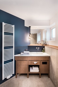 The design is derived from the name of the hotel and the character of the city. The »Domizil« (= home) exudes a good feeling, resulting in a bright mood and rousing confidence. The peaceful effect of the Neckar River and its colours are incorporated into a harmonious concept. Natural colour contrasts, relating to the famous houses of Tübingen Old Town are created in combination with wood and leather tones, as well as black metal.