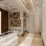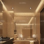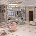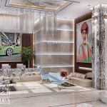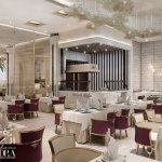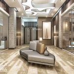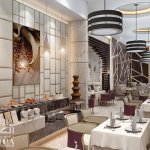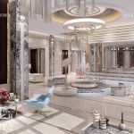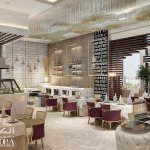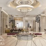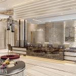 Bright lobby welcoming the guest with an elegant atmosphere. Marble, crystal chandelier, unique art pieces, modern style furniture, and water feature in combination creates a cozy and luxurious feel.