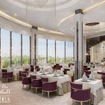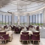 Hotel restaurant with buffet set for the guest to enjoy the meal overlooking the landscape view through panoramic windows.