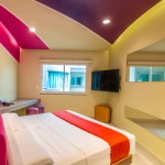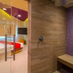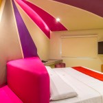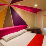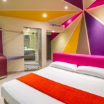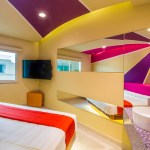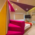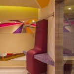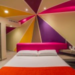 The common thread is the uninterrupted exchange of strokes, shapes and colors imprinting dynamism to the walk between the rooms filled with purple, pink and sand tones. In the interior of each room the colors trajectory continues through the concave plafond transmitting a funny and psychedelic felling that is emphasized in the beds angles.