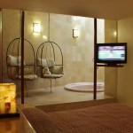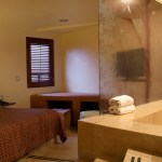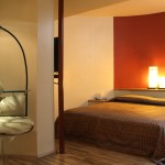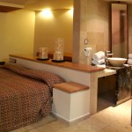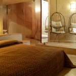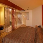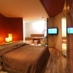 There are 10 different kind of rooms divided in 3 major categories: standard, suites and master suite. In all the rooms the door that divides the bedroom from the bathroom has a grand translucent photo mural to create privacy and allow light to come through. The lighting design in every room creates different ambiances and the intensities may vary from one area to the other. The TV rotates to be seen from every point and there is full mirror that also rotates and has an image on the back.
