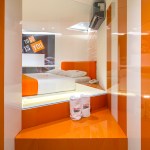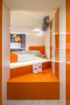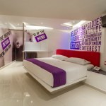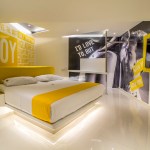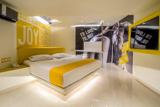 The design of the rooms was supported with graphics inspired in the work of artist Barbara Kruger, that were balanced with white walls to reach the correct percentages of elements, graphics and color, in harmony with the main elements of the room. The bed was placed at 30° defining the starting point for the distribution of the space. Behind the headboard an angled Foreplaydome was designed and the shower is surrounded by glass framing the view towards the room.