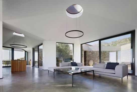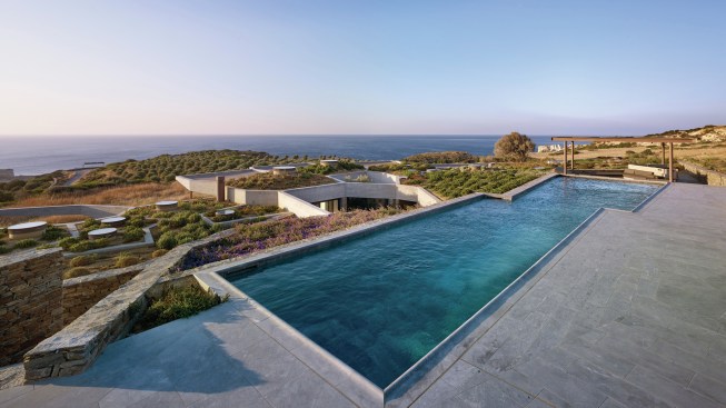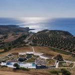 exposed concrete beams with their shading canopies cantilevering beyond the stone facades and dissolving in front of the uninterrupted panorama of the Aegean Sea.