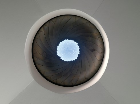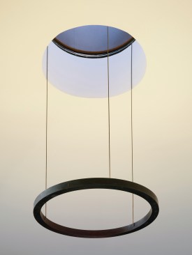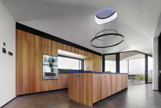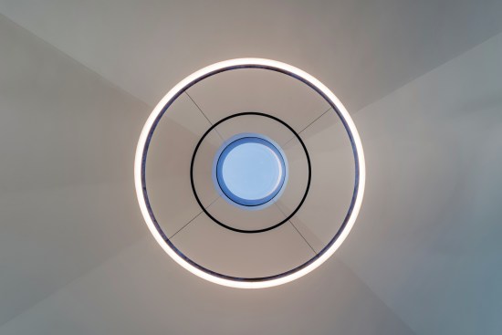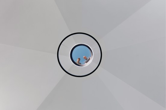 The ceiling flows and, with its light undulations and punctures, gently accompanies the inhabitants through the rooms. The skylights at the apex of each cell open up creating an effective passive ventilation system, warm air traveling up towards the cones and the circular skylights and bursting out in the summer months. In the bedrooms, a black out device, controlled by a switch near the bed, is placed under each skylight. It is a mechanism that works like the shutter of a camera lens. For ambient illumination, a circular metal disc suspended under the apex conceals a linear light.
