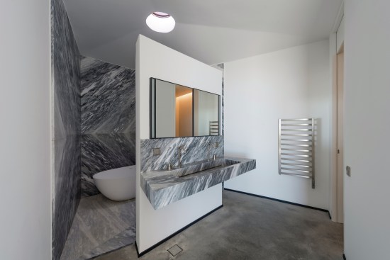 Moving inside the carapace of the house, the smooth candid white vertical surfaces, washed by the zenithal light, contrast with the ponderous expression of the exterior enclosure. The rooms witness the passing of time, the moving of shadows and the changing colors of light bouncing off walls and floors.