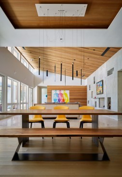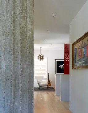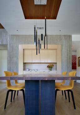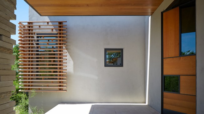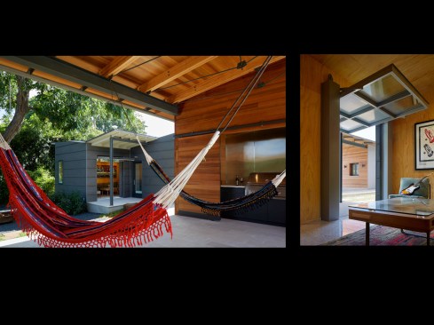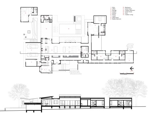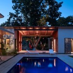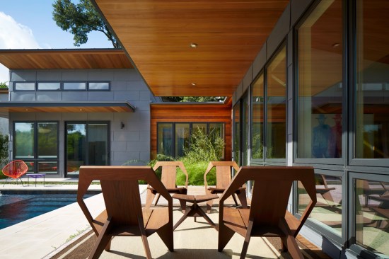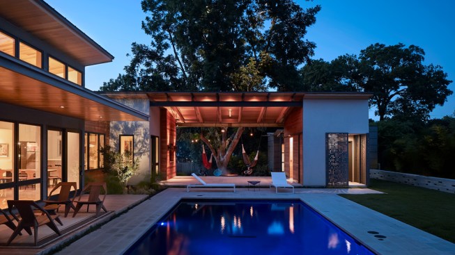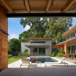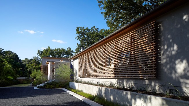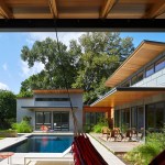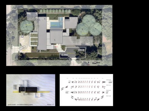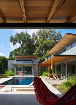 House 117 is a new home for a single father and 2 sons. Consisting of 4,500 sq. ft. the residence is designed to reflect the active lifestyle of the young family and their appreciation of the outdoors. Organized around a south east facing courtyard, the exterior living room works to channel the summer breezes through the shaded hammock room while offering connection to the pool and the sports court at the rear. The 3 bedroom home continuously offers views to the landscape and outdoor spaces while sheltering from the hot Texas summer sun. Upon arrival one enters the shaded west-facing courtyard while in a sequence the residence reveals itself given the option to continue toward the more public and or private areas of the residence. The central spine of cast in place reinforced concrete serves as a linear organizing element allowing the spaces to connect from and radiate beyond. The wood clad utility room serving as the core houses the utility, mechanical, data and audio equipment. The rear north facing attached carport is located 7 feet below finished floor of the residence. The roof of the carport is planted with native Texas grasses and serves as a visual landscape from within the kitchen and the outdoor living room. A small guest quarters / music room offers the occupants a secondary private space. The ensemble seeks to develop a relationship between interior and exterior spaces with a contemporary response to modern lifestyles.