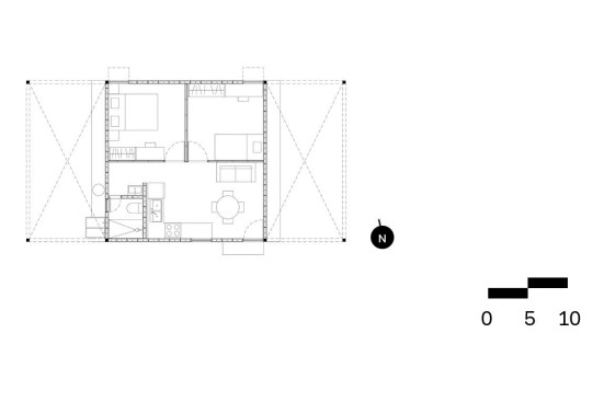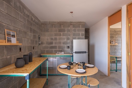 Designed with future expansion in mind, this housing unit understands that one cannot limit or condition the characteristics and materials of this expansion. Acknowledging prevailing trade winds that blow northeast to southwest in the summer and east to west in the winter, the house orients its entry to the north and closes off its east and west elevations. (Doors and windows at the house’s corners allow for diagonal cross-ventilation matching the direction of summer winds.) Kitchen and living spaces are placed along the house’s northern face, to cool or shelter bedrooms from seasonal winds. Set within a larger structural frame, the initial construction allows for significant infill, almost tripling the home’s square footage— an expansion of significant value for areas where residences often include commercial or production spaces. Additional personalization occurs through finishes.