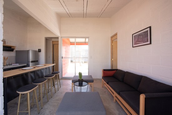 The proposed housing unit is ordered as two bays around a fixed service core; one bay houses a wood-framed interior space, the other a fiberglass-covered exterior terrace. Offering shade and protection from the elements, these portico spaces create fluid and flexible living between interior and exterior. Non-structural partitions allow for a similar fluidity or flexibility(and programming) of the unit’s interior and, after painting by residents, in its appearance.